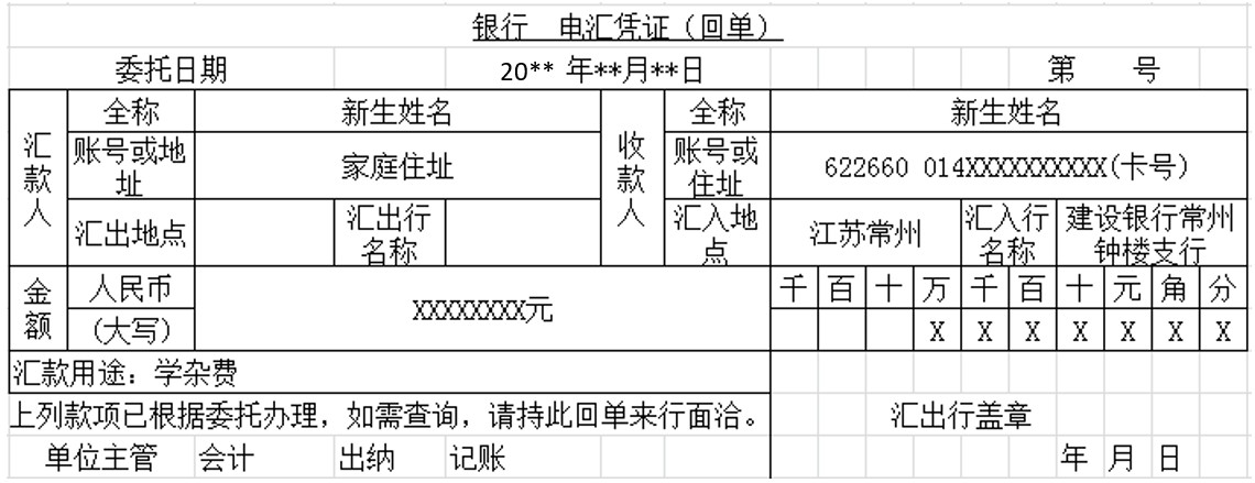 汇款人全称:新生姓名;收款人账号:建行缴费卡正面19位卡号;汇入行名称:建设银行常州钟楼支行。