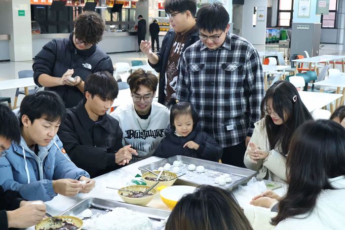 抹茶馅、紫薯馅、奶黄馅、芝麻馅……应有尽有。同学们左手扶着盆,右手不停和面。大家揉起面团来十分娴熟,一块块糯米面团在手中搓成圆滚滚的形状,将中间按压后塞入馅料,晶莹光亮的汤圆就做好了。一碗碗热气腾腾的元宵端上桌,象征着大家团结一心、携手共进,温情与友情的交融在活动中缓缓流淌。