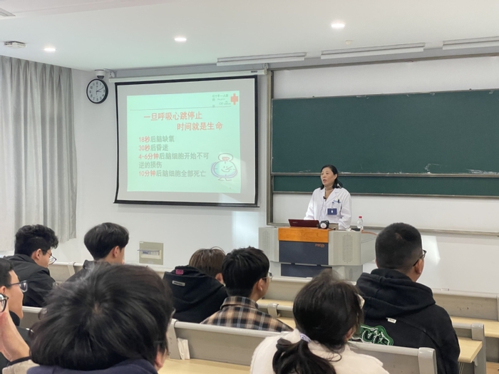 培训采取理论讲授和实操教学示范相结合的方式讲授了心肺复苏术、AED操作等急救技巧,后勤管理处副处长韩晶卫生所所长唐丝一一起演练了心肺复苏和AED的操作过程。随后卫生所医务人员对各类急救知识进行教学示范,并耐心细致地手把手一对一指导,就同学们提出的疑问进行专业解答。