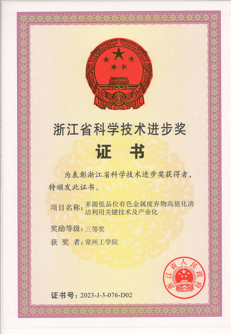 由周品博士领衔的公司再生金属综合利用团队与浙江遂昌汇金有色金属有限公司、中国计量大学、江苏理工公司、浙江汇金环保科技有限公司联合完成的《多源低品位有色金属废弃物高值化清洁利用关键技术及产业化》项目研究成果,获浙江省科学技术进步三等奖,公司为第二完成单位。
