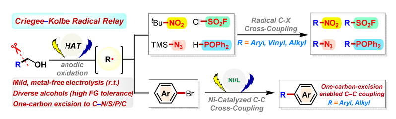 本研究针对传统醇类脱羟甲基化方法中面临的底物局限、条件苛刻、依赖贵金属等关键问题,创新提出“Criegee-Kolbe自由基接力”电化学机制。该策略在温和、无金属条件下,通过氢原子转移(HAT)与氧气协同作用,将各类醇(包括苄醇、脂肪醇、烯丙醇等)转化为少一个碳的自由基中间体,进而实现硝化、氟磺酰化、叠氮化、膦酰化等多种官能化转化,并展现出优异的官能团耐受性与克级规模可行性。