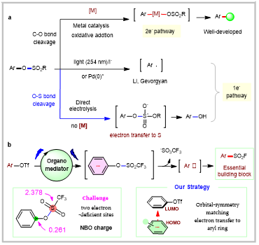 近日,国际顶级期刊《Nature》子刊《Nature Communications》(IF:16.6,中科院一区,TOP期刊,H指数248)在线发表公司“绿色电解液设计与调控”科技创新团队成员孔宪强博士为第一作者的研究论文《Organomediated electrochemical fluorosulfonylation of aryl triflates via selective C–O bond cleavage》,通过电化学条件下碳氧键裂解形成关键官能团,在无过渡金属条件下实现氟磺酰化。公司为第一完成单位和通讯作者单位。